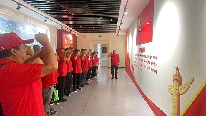 在紀念館內,黨員們面對鮮紅的黨旗,一起高舉右手,再次重溫入黨誓詞,鏗鏘恢宏的誓詞,使每一位黨員再次接受了心靈洗禮,銘記莊嚴承諾,牢記共產(chǎn)黨員的責任擔當和光榮使命。