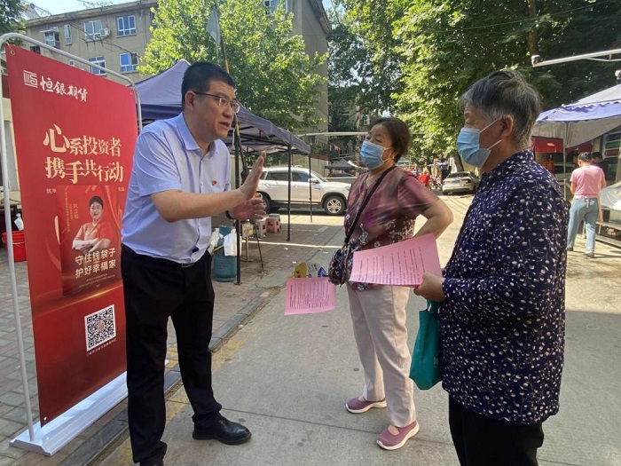 為進一步深入貫徹落實處置非法集資部際聯(lián)席會議相關(guān)工作要求,根據(jù)河北省打擊和處置非法集資工作領(lǐng)導小組印發(fā)的《2023年防范非法集資宣傳月活動動作方案的通知》,2023615日,國富投資集團所屬恒銀期貨有限公司(以下簡稱“恒銀期貨”)聯(lián)合東風派出所,恒銀期貨總經(jīng)理湯志江、副總經(jīng)理張南組織公司各部門骨干力量深入社區(qū),開展了防范非法集資的線下宣傳活動。