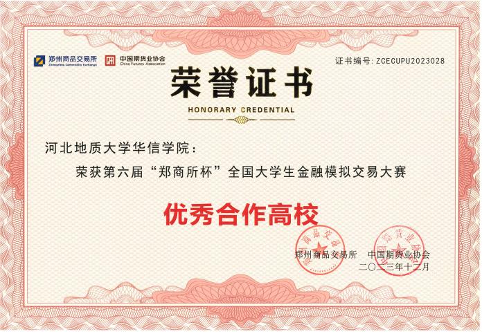 河北地質(zhì)大學(xué)華信學(xué)院榮獲第六屆“鄭商所杯”全國(guó)大學(xué)生金融模擬交易大賽“優(yōu)秀合作高校”稱號(hào)