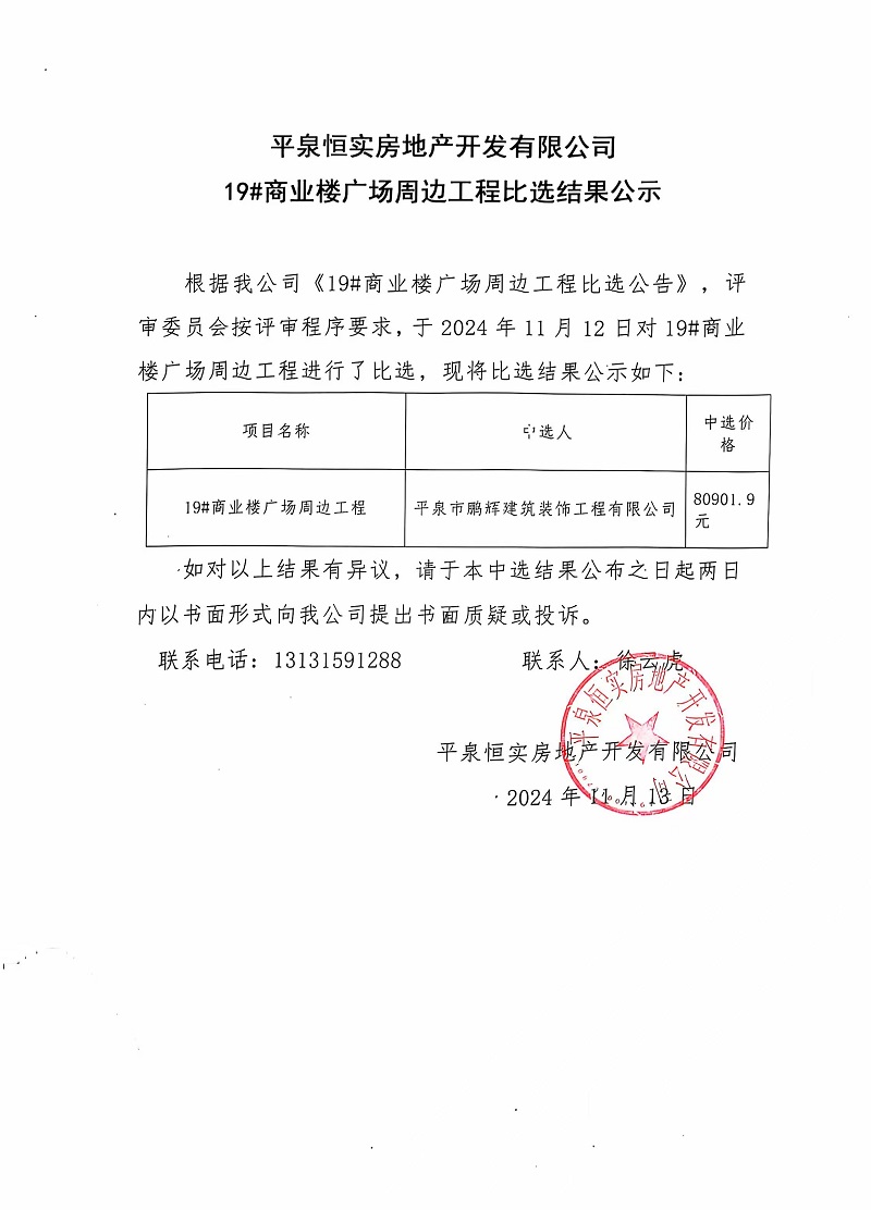平泉恒實(shí)公司19#商業(yè)樓廣場(chǎng)周邊工程比選結(jié)果公示
