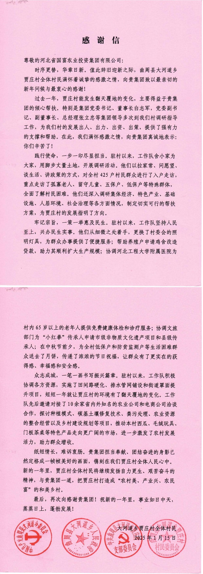 2024年,國富集團駐賈莊村下沉工作隊緊緊圍繞發(fā)展集體經(jīng)濟、推進鄉(xiāng)村振興的目標(biāo),深入學(xué)習(xí)中央政策方針及省市縣委組織部和集團黨委有關(guān)下沉工作要求,扎實開展駐村幫扶工作,經(jīng)過一年的努力,取得初步成效,同時也得到了曲周縣大河道鄉(xiāng)和賈莊村的認可,特給我集團送上錦旗和感謝信!